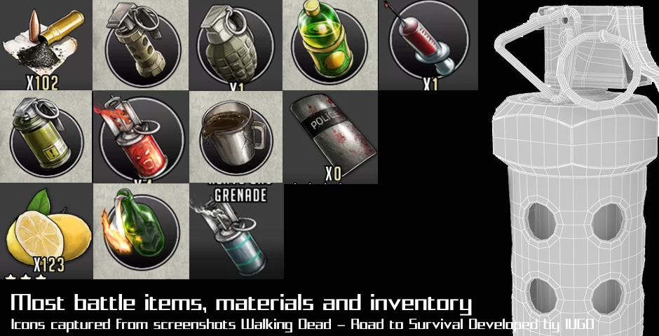 Icons, Battle items, Inventory. Most items were created in Maya as a gray polygon, then rendered and repainted in Photoshop.